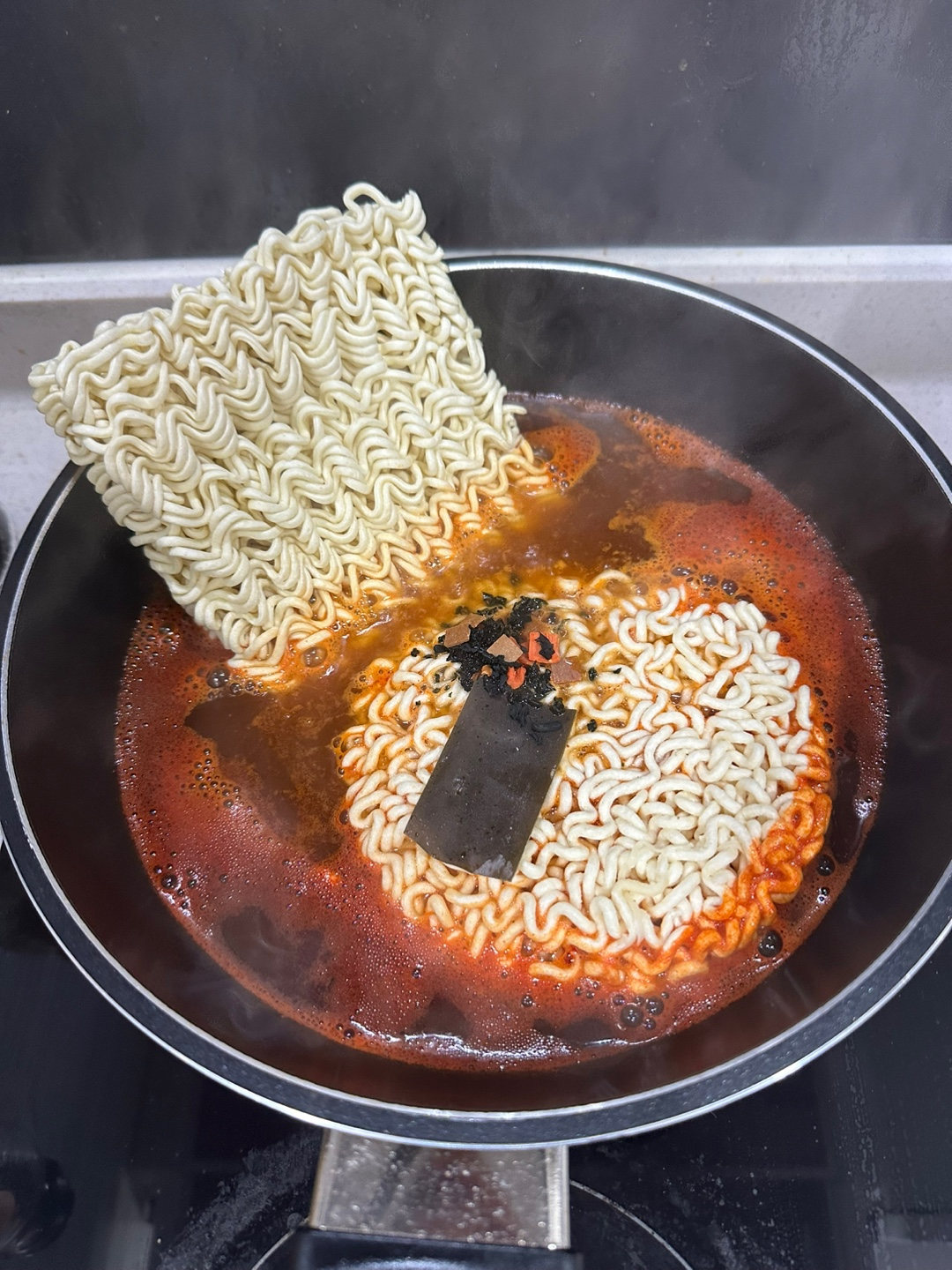 물이 끓기 시작하면 면을 넣고 끓여줍니다 중간중간 간을 보시면서 짜면 물을 좀 더 추가하시면 되고 싱거우시면 스프를 좀더 첨가하시면 됩니다. 개인적으로 좀 더 맵게 먹고싶어 청양고추 조금 추가했습니다~